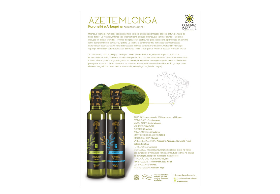 Quando receber seu azeite mensalmente, ele virá sempre acompanhado de um encarte que pode ser arquivado, contendo informações relevantes sobre o produtor e o azeite. Este encarte conterá também sugestão de receita e harmonização para seu azeite. Há um campo onde o assinante pode fazer anotações e avaliar o azeite. Além disso criamos um ambiente online, exclusivo para nossos assinantes, que é atualizado periódicamente com informações relevantes da cadeia produtiva do azeite de oliva, sobretudo do azeite brasileiro.